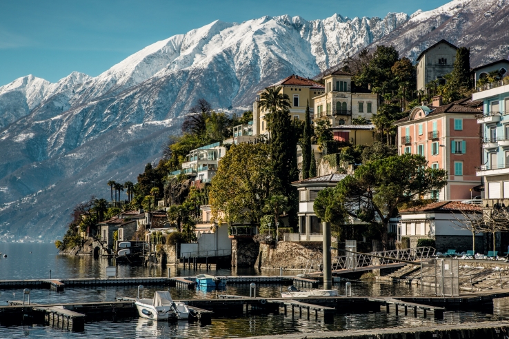 "Ascona rests on Lake Maggiore’s northern shore. Pastel houses line the promenade, cafés spill toward the water, and cobbled lanes wind past galleries and hotels. Italian charm lingers as the Swiss Alps rise behind, making it an ideal base to explore nearby lakes, valleys, and villages."