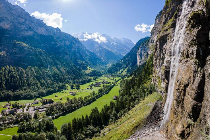 The Lauterbrunnen Valley has been welcoming tourists since the 19th century, keen to see this region of 72 waterfalls. Goethe wrote his poem 'The song of the spirits over the waters' after a visit. Tolkien came in 1911 and some say that this beautiful lush valley with its mighty falls and rushing stream was the inspiration for Rivendell in Lord of the Rings. Some of the most famous falls here are Staubbachfall in the village itself (one of Europe's highest free-falling waterfalls), the Mürrenbachfall dropping over the 417m cliff, and the Trümmelbach Falls – 10 glacier waterfalls inside the mountain where up to 20,000 litres of water per second thunder through the narrow gorge.
