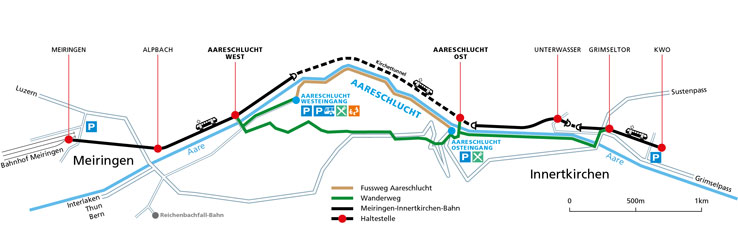 The closest town to the Aare Gorge is Meiringen. From Meiringen there are direct rail connections to either the west or east entrance.