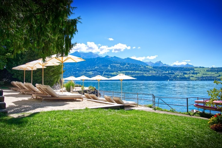 The Beatus has a wonderful position on Lake Thun, with views over the water and to the mountains of the Bernese Oberland beyond. There are plenty of walking paths in the immediate region and the small town of Merligen is close at hand. You can also take a relaxing cruise along the lake to Thun or Interlaken. The hotel offers the perfect place for summer relaxation, with its private beach and harbour, tennis courts, delightful gardens set up for sunbathing and a heated outdoor hydrotherapy pool. The extensive wellness facilities include a series of saunas, wellness baths and sensory showers, an indoor swimming pool, relaxation room, massage and beauty treatments (payable locally), gym facilities and a complimentary exercise programme. Dining takes place at the Table Dhôtes restaurant which has an excellent range of dishes, while L'Orangerie piano bar offers cocktails, lighter meals and spectacular views across the lake. The Seelounge is a stylish terrace, perfect for a drink at sunset.