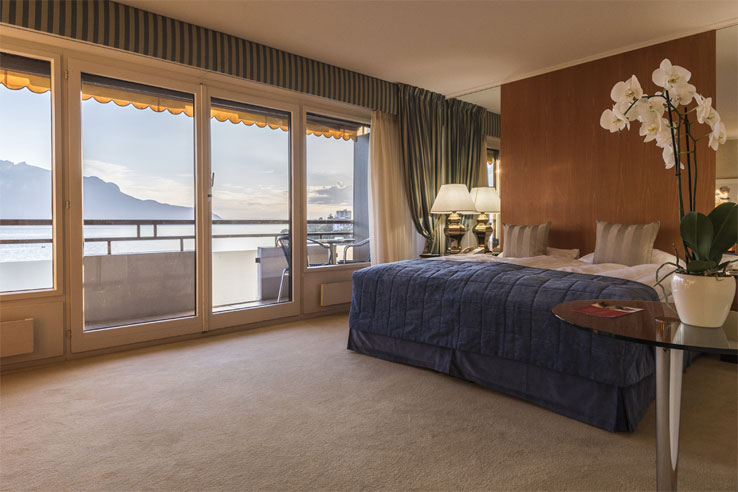 The Royal Plaza is the only five star hotel in Montreux located directly on the shores of Lake Geneva and offers magnificent views over to the impressive mountain peaks of the Alps. With direct access to the lakeside promenade, the centre of Montreux is only a ten minute stroll away. Half board at the hotel includes a 3 course evening meal, while the acclaimed Café Bellagio is an à la carte restaurant which has been recently renovated. It has wonderful views over the lake and is open for both lunch and dinner along with the relaxing lakeside terrace. Sinatra's Bar is also newly refurbished and is ideal for relaxing over a cocktail on the beautiful terrace and offers light meals until late. The Sunset Bar is situated next to reception with panoramic views of the lake.