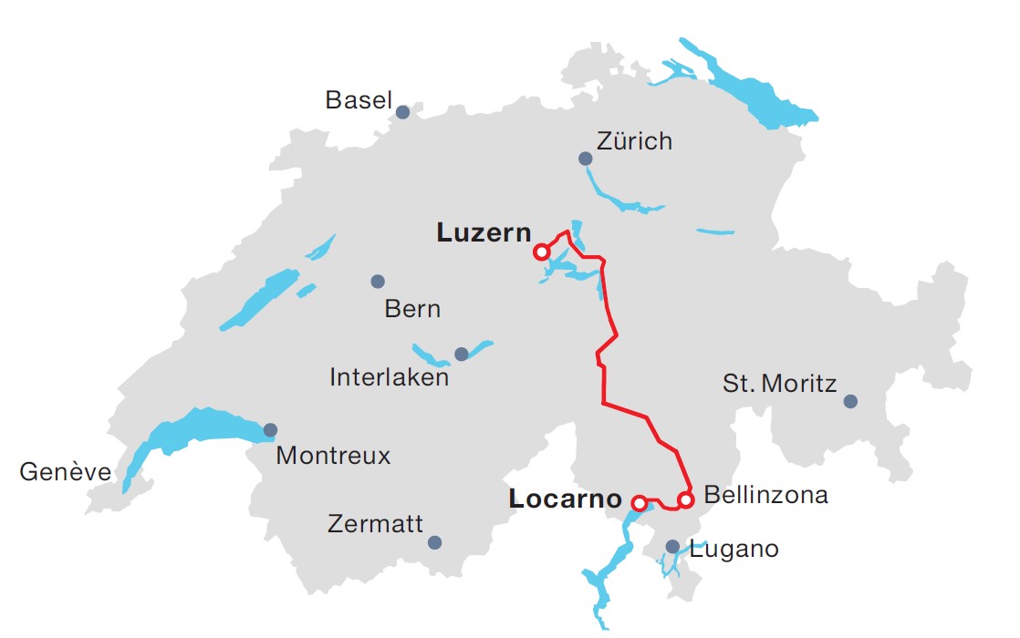 "Visitors have been enjoying this journey across the Alps via the Gotthard Tunnel since 1882. The mountain scenery en route is spectacular. You will enjoy stays beside two lakes - Lucerne and Maggiore - and have the opportunity to compare the scenery of Central Switzerland with that of the Ticino region. "