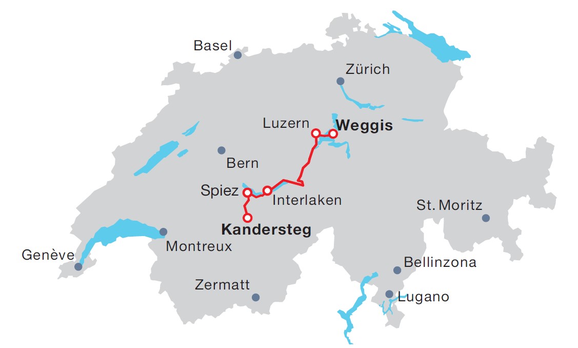 • Regional rail travel Interlaken-Spiez and Lötschberg Regio Express Spiez-Kandersteg (2nd class)